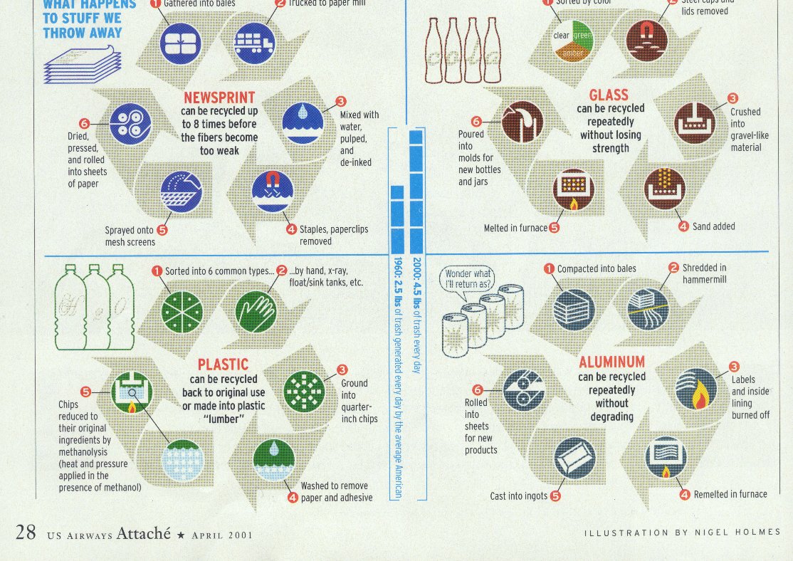 While Almost all of us recycle both at home and at work, few of us are aware of the amazing materials and products that come from our efforts. That Polartec fleece pullover you're wearing is fashioned from approximately 25 recycled plastic soda bottles. The president's running track at the White House is made from rubber of discarded tires and windshield wipers. And more then 60 percent of Baltomore's streets are now paved with "glassphalt," an aggregate made from asphalt and crushed recycled glass. The latest news on the golf course and playing field is that recycled rubber chips made from shredded tires are now used to strengthen the soil and improve drainage. These are just some of the examples of what's known in the trade as "secondary recycling turning recycled materials into new products, ones completely different from what those materials once were. significantly, these new materials are helping to drive a slow but study increase in the percentage of disposable products that Americans are putting back into use. The national recycling rate is up to 27 percent. That's a fair amount below the targets advocated by environmental groups (and below the U.S. government's goal of 35% by the year 2004). But it's a step in the right direction from where we were 30 years ago, the first time we celebrated Earth day. The good news is that everywhere you look in our world these days, exciting new technologies are creating more applications and possibilities for recycled materials. Broader community involvement has expended recycling programs in hundreds of towns and cities. In addition, many U.S. corporations have increased voluntarily their "product stewardship." This idea of using more recycled materials in the manufacturing sector and and doing of doing a better job of handling pre-consumer wasted has expended the demand and markets for recycled products. in other words, recycling is now economically feasible, if not advantageous. Unfortunately, the bad news is that the average American generates nearly 4.5 pounds of trash every day-up two pounds from 40 years ega. Our country is by far the most wasteful on the planet, twice as wasteful as many industrialized countries. And many environmentalist have gnawing sense that recycling will not keep pace-that it is incapable of cleaning up a society so firmly built on convenience and consumption. So how did this ambulance of waste and the recent need to recycle come about? SOME TRASHY HISTORY: Recycling, as a concept, is really rather new. Our distant relatives who battled the element to hunt and gather food made use of everything they acquired, resources and raw material that were precious could not be wasted. This frugal way of existence continued in the Neolithic period, when farming also required careful management of materials. What little waste there was, usually organic matter, was used as fuel, fertilizer, or animal feed. As villages and cities developed, unusable food scraps and other items were simply thrown out on the street to be eaten by domestic animals (usually pigs). The rest was picked over and scavenged by humans for reuse. This natural practice could be called our earlier form of recycling. From our ancestors, we have learned that the scavenging part of that equation creates near total efficiency though recycling. Anything of any value is eventually sorted, recovered, and put back to use. That early system of slopping and scavenging continued in Europe and the United State well into the late 1800s, and to this day continues in many parts of the developing word. Recycling materials and objects was simply a necessary way of life. In Waste and Want: A Social History of Trash, Susan Strasser notes the discovery of a broken stoneware bottle from an early Virginia plantation: The top appears to have been pressed into service as funnel while the bottom was turned into a bowl. In pioneer America, costly glass bottles for milk and beer were filled and refilled. Even newspapers were collected for reuse as insulation or as packing materials. Worn-out shoes and clothing that were not passed on were used for patches. Scraps of cloth were converted into quilt or rag rugs. And anything broken was repaired. (It was a rule, far chipper to fix something than buy a new one. Rather than being replaced, damaged fine clothes were even sent back to Europe for repair.) In those times, there was excess and nothing at all resembling "disposable." American society changed rapidly with the mass production that marked the first quarter of the twentieth century. For the first time, fashion and marketing created a sense among consumers that products became outdated or went out of style, needed to be replaced on regular basis. Marketing geniuses realized that packaging could become an elaborate selling tool, its purpose to be attractive and then thrown away. And it became cheaper to replace broken items than to repair them. Following World War II, the waste stream grew along with the need for sanitary, "healthier," one-use paper products such as paper towels, paper cups, paper plates, napkins, tissues. It wasn't until the social revolution of the 1960s that the modern idea or recycling took hold. It was during the first Earth Day celebration in April 10970 that the container Corporation of America sponsored a contest for the design o f a "paper recycling" symbol. From more than than 1,000 entries submitted, Gary Anderson's now familiar three chasing arrows was selected. That symbol has graphically represented a movement that has grown, in the past three decade, from paper and bottle "drives" to sophisticated recycling center that accept and process glass, tin aluminum, scrap metal, tires, batteries, electronic equipment, Styrofoam, paint, plastics of most kinds, and yard wastes. RECYCLING LESSONS Volumes have been written about the science and chemistry of recycling. But even a quick glance offers a good idea of what's involved. Most of the 4.5 pounds of trash t