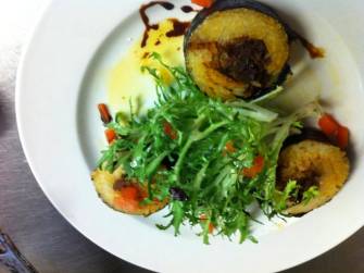 Ingredients:- to convert - 2 sheets of Maki dry seaweed - 3 oz. Cabbage Kimchee - 1 large duck leg confit - 4 oz Short grain Jasmin Sushi rice Steamed - 2 oz clarified butter - Soy sauce, white wine, garlic and sesame oil thicken with corn starch - 1 once rice vinegar - Frisee, tomato concasse, oil and vinegar.