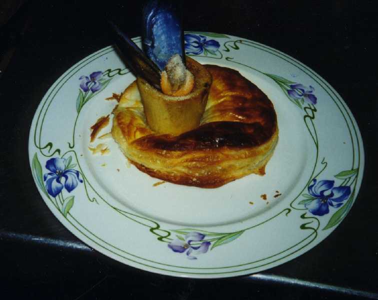 In 1986, as I was just starting to be acquainted with Amelio's. Bone marrow was on my agenda as a tasty substitution for butter. Marrow I thought, would blend and emphasize the texture and saltiness of the clams. The cavity of the bone was also offering a possibility for an attracting presentation. Tools: - 1 qt sauce pan with lid -5 inch round plain pastry cutter - baking pan -boning knife - pastry pin Ingredients:-