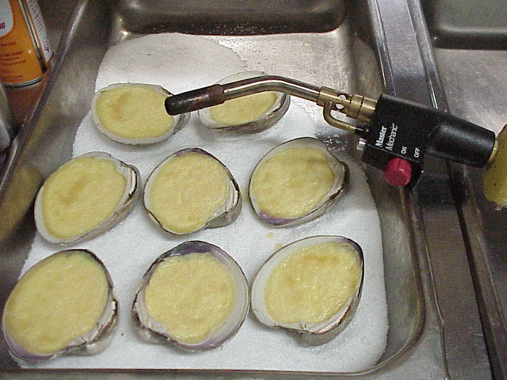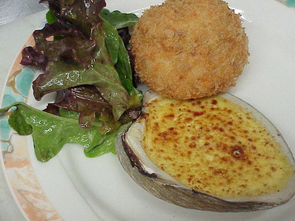 A fish company in Boston picked me up one morning to explore their facilities. The gain of the trip was these giant clams, bigger than any clams I had ever seen. I went home with samples. The cavity of the shells attracted me. What could I bake or serve in this? I choose the impossible: a Crème Brûllée without sugar. Tools: - 1 qt sauce pan with lid -a blow torch -a deep fryer or a small wok -1/2 sheet pan Ingredients:- to convert -3 quahogs clams Mix: -1cup.heavy cream 4 egg yolks -1 tsp. grated ginger Dumpling:-2 oz filet of salmon finely pureed -1tsp.chopped garlic -1oz.chopped parsley -1 pinch cayenne pepper -mesclun salad (optional) -2 cups of peanut oil -2 oz. bread crumb or Japanese Panko .2 lb. Coarse salt -2 oz. of sieved brown sugar. Steps: 1)Clean the clams in water and rock salt. depose them in a sauce pan and with 1/2 cup of water and cover with a lid. Cooks over low heat until the shells open up. 2)Remove the meat, trim tendons and wash the intestines. Separate, clean and reserve the shells. 3)Mix cream eggs and ginger together and adjust seasoning to taste with cayenne and the reduced juice of the clams. Put each half shell on a 1/2 sheet pan, using the coarse salt to stabilize. Fill each shell with the cream batter and bake in a 400º oven until the mix has settle (about 10 minutes). 4)Mix all the ingredients of the dumpling plus the clam meat coarsely chopped. Form 6 balls and coat them with the bread crumb. Deep-fry the balls in the oil for 10 minutes (not too hot or the crust will burn) and drain on paper towel. 5)Spread a very thin coat of brown sugar evenly on the top of of the clams and glaze rapidly with the blow torch. 6)Assemble Shell, balls and the optional salad all on the same plate according to the picture. Chemistry: (to be developed) Wine recommendation: Firestone Sauvignon Blanc 1999 www.firestonevineyard.com/99sb.html |