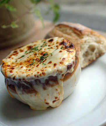 http://how2heroes.com/videos/soups-sauces/french-onion-soup Make Onion Soup seems to be an easy task but one must spend the right time to archive perfection. Cooking the onions until brown is the secret. It gives an unequaled sweetness and flavor to the soup. The other secret is the dry bread that will keep the cheese afloat while browning. The Swiss cheese gives the flavor and the Munster the gluey consistency. Tools: - 1 gal sauce pan - kitchen knife - Onion Soup Bowl - Grill Salamander or oven with grill possibility Ingredients:- to convert - 2 cups dry white wine - 3 oz. all-purpose flour - 10 lbs peeled Spanish onions, sliced by 1/2 first and then 1/2 inch thick slices - Ground Black Pepper -Salt - Knnor bouillon cubes (optional) - 4 slices Imported Swiss cheese - 4 slices American Munster cheese - 8 very dry slices of baguette. Steps: 1) Cook the sliced onions slowly, over very low heat until they have render all water and became brown and thick 2) Spread the flour over and mix well to avoid lumps 3) Add the wine and bring to a boil. 4) Add 2 quarts of beef stock (or water), bring to a boil and add salt and pepper to taste (the bouillon cube can be added at this point if you use water. However, just water makes it a delectable vegetarian onion soup 5) Fill the onion soup bowls , put 2 croutons floating over each soup and place Swiss cheese first then the Munster. Gratine the soup and serve hot. Chemistry: (to be developed) Wine recommendation: Robert Mondavi Coastal Chardonnay