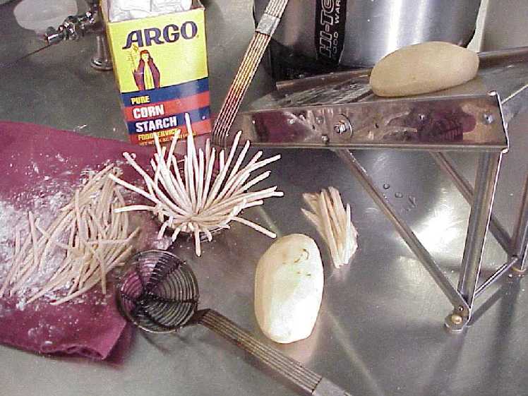1) Pell the potatoes and slice them length wise on the small blade of the mandinine2)Cut a perfect square removing little as possible. 3)With a parry knife, cut deep a square at 1/4 inch from the sides on everyone of them, careful of not cutting pass the corners. |