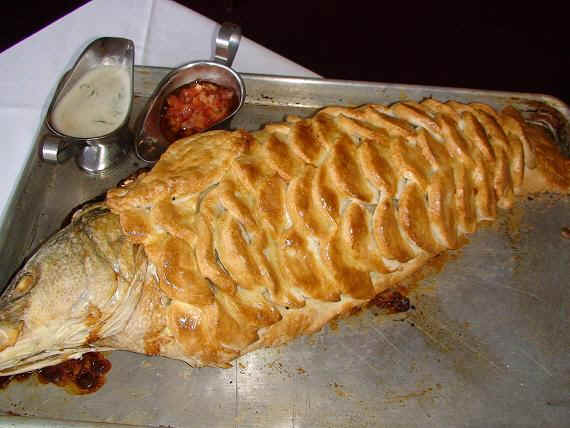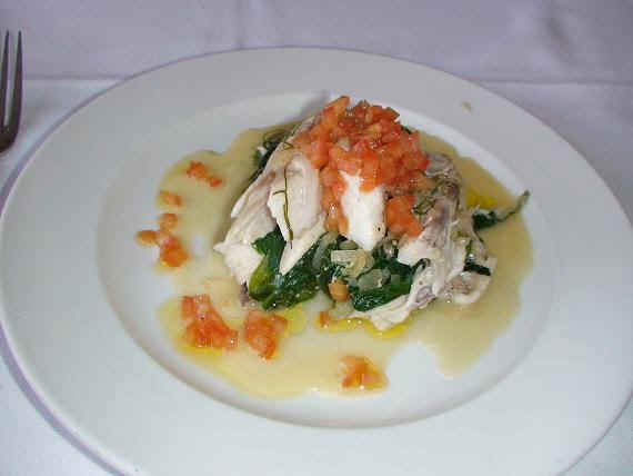 (Serves 4 People) This is a great recipe for holidays. It can be done for as many people as you wish. All you have is to order a bigger fish and make sure the oven is big enough for the fish to be baked...The fish must have scales on and be fresh. The scales filter the salt, impregnating natural gelatin into the fish flesh and sticking to the dough while baking to make it easier to remove the skin. The fish coming out of the oven should go straight to the guest table and be carved open by half (the scales and skin will stick to the dough making it easy to serve just the meat of the fish) Tools: - 2 cup sauce pan - 5 inch round plain pastry cutter - baking pan - brush - pastry pin - dinner fork - Small knife Ingredients:- to convert - one 4 lbs Sea Bass with bone and head, scales on and not gutted - 2 lbs all purpose flour - 1 lbs rock or Kosher salt - 14 oz. water - 2 lbs fresh spinach - 2 oz finely sliced shallots - 2 oz butter - 1 egg wash Dill Butter Ingredients: to convert - 6 oz. butter - 2 oz finely chopped shallots - 1 bunch dill - 1 cup white wine - salt and pepper - Tomato concassé Steps: