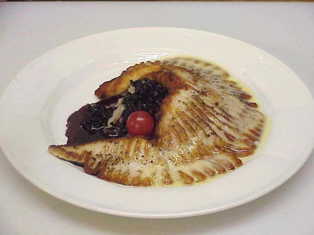 The visit of Hubert Trimbach at Amelio's in the fall of 1997 had me dig into my Alsatian background to match the Trimbach Riesling. Skate fins (The French ailerons de raie cannot be translated by wings) and cabbage cooked in wine seemed to be logical for this magnificent wine. Tools: - 1 qt sauce pan with lid -5 inch round plain pastry cutter - baking pan -boning knife - pastry pin Ingredients:-