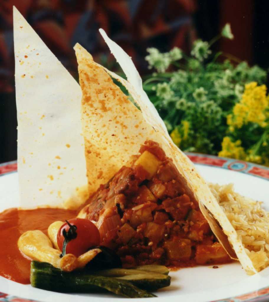1/4" thick Steps: 1) Saute the onions and bell pepper in hot olive oil for 5 min 2) Add the chopped tomato and the garlic and simmer for 15 minutes 3) Season with salt and Cayenne pepper 4) Wash the eggplants quickly with running water and drain over paper towels. Sear with hot oil and add to the tomato onion base and cook 10 minutes 5) Now, it is time to sauté the zucchinis very fast and in hot oil also add to the ongoing vegetables tomato base 6) Finish cooking for another 10 minutes 7) Remove the Bouquet Garni and serve hot between layers of baked Phillo/ Parmesan sheets 8) Finely julienne basil can be spread over all. Chemistry: (to be developed) Wine recommendation: (to be found)
